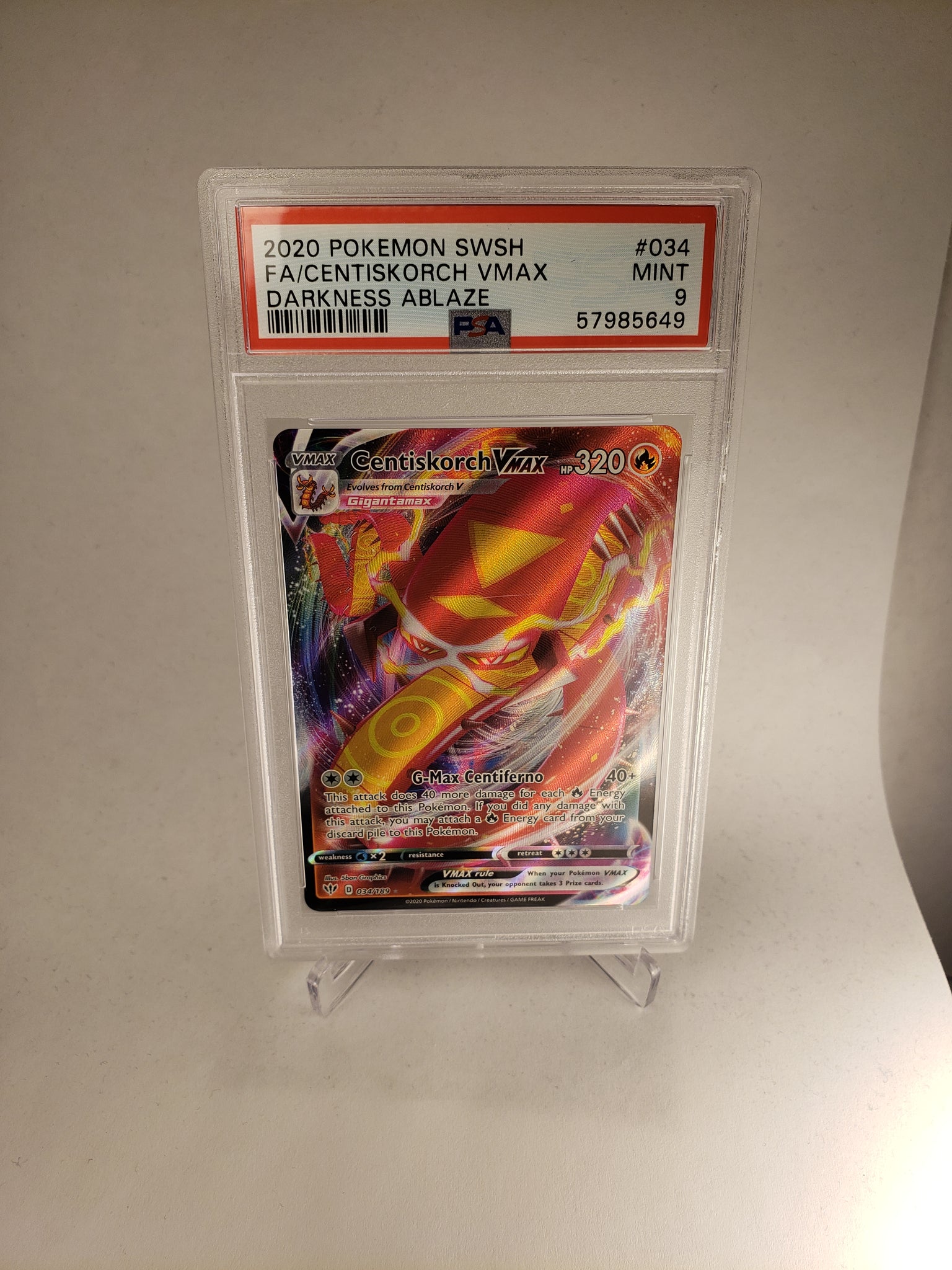 Sorry! Our 2020 Pokemon Darkness Ablaze Full Art Centiskorch Vmax PSA 9 is currently sold out.